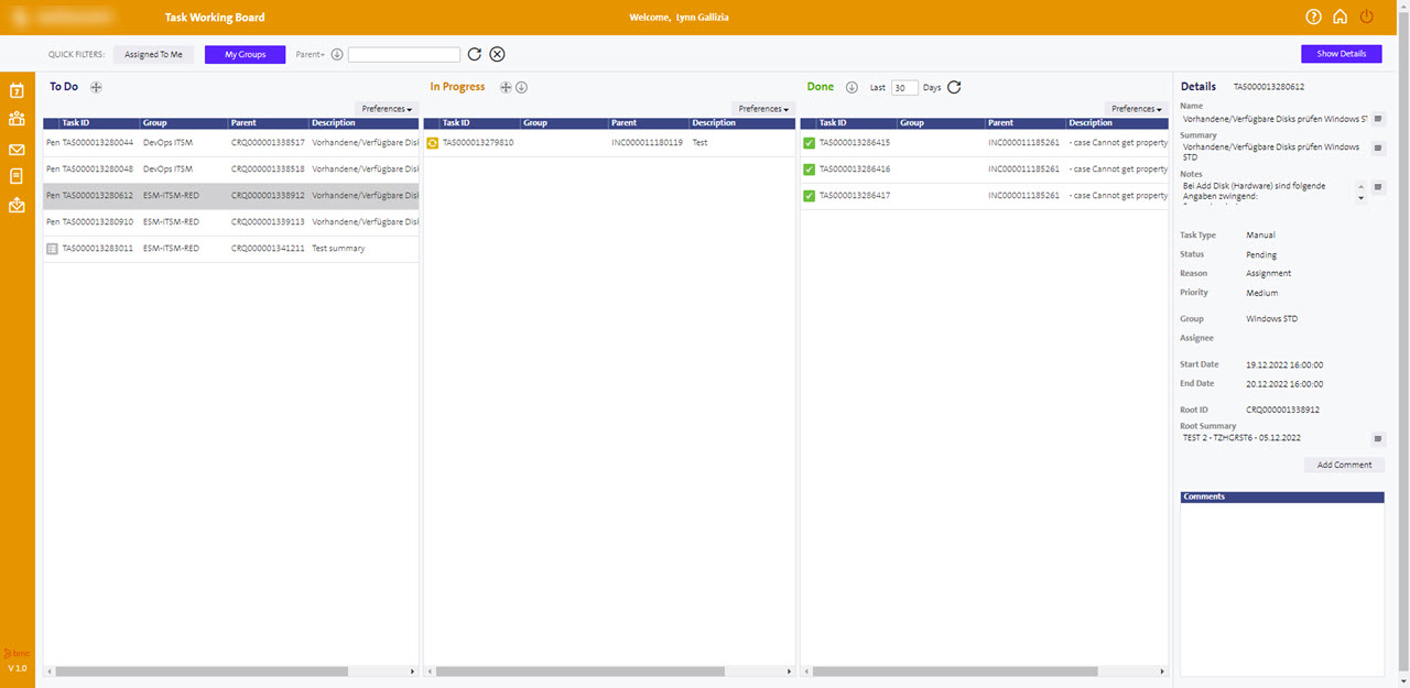 Task Board, developed and introduced by me, is a very simplified custom GUI to get quick access to assigned tasks. It follows the same concept as in ServiceNow or Atlassian Jira. A Task Implementor can see only the tasks assigned to him/her or to his Support Group(s). The tasks can be moved by “Drag & Drop” to a new status.
